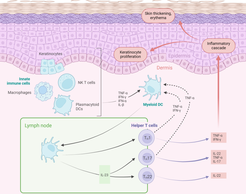 The pathogenesis of psoriasis is complicated and multifactorial, involving genetic, immunological, and environmental contributions, and is not completely elucidated. In the early stages of psoriasis pathogenesis, a range of cell types, including keratinocytes, natural killer (NK) T-cells, macrophages and plasmacytoid DCs, secrete various cytokines (e.g., TNF-α, IFN-α, IFN-γ, IL-1β) that stimulate myeloid DCs. These activated myeloid DCs secrete excessive pro-inflammatory cytokines (IL-12, IL-23, and TNF-α), which in turn drive the differentiation of naive T-cells into Th1, Th17 and/or Th22-cells. Th1-cells release IFN-γ and TNF-α, Th-22 cells produce IL-22, and Th17-cells secrete IL-17, IL-22 and TNF-α to potentiate disease pathogenesis.